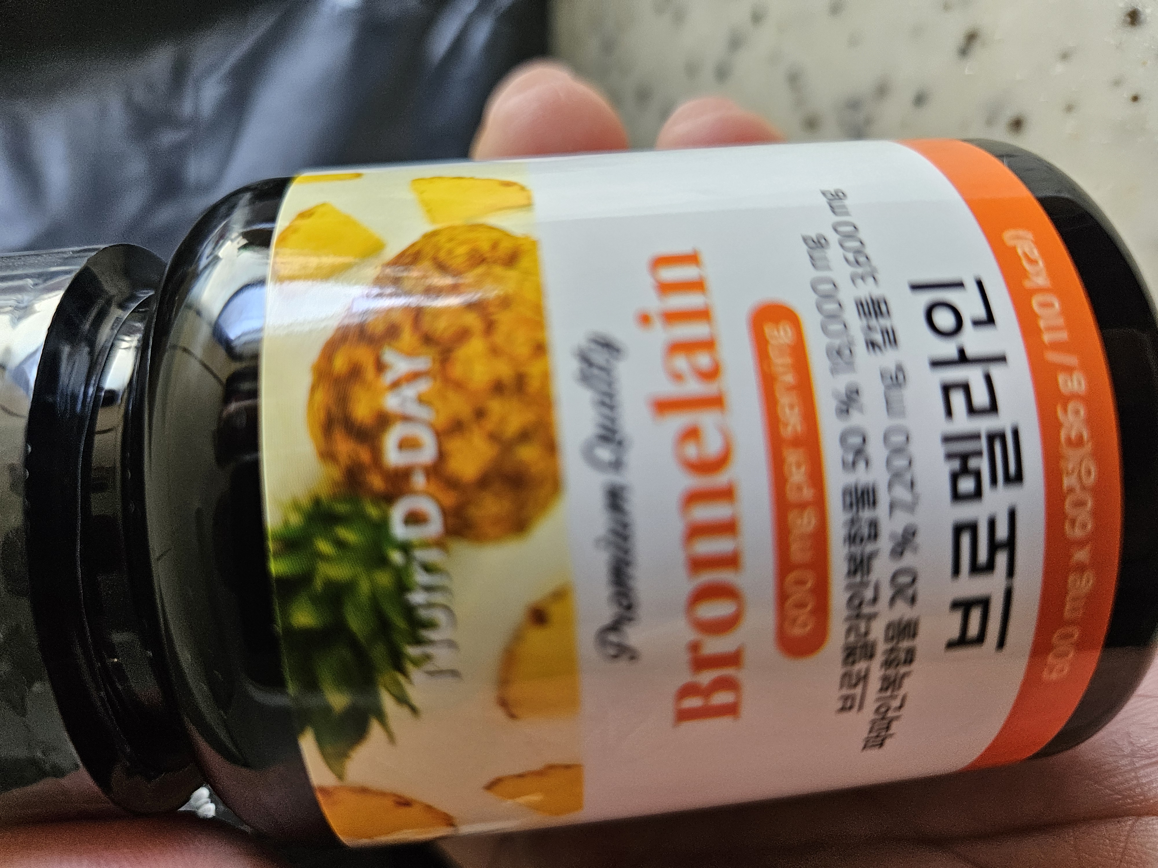 검은색 병에 오렌지색 글씨로 "브로멜라인"이라고 적혀있고, 파인애플 일러스트가 배경에 그려져 있어요.