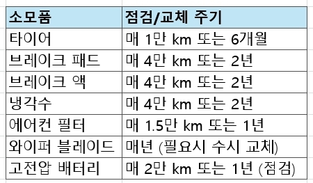 위에 언급된 점검 항목들 중에서 소모품 교체 주기를 다시 한번 정리해드릴게요!