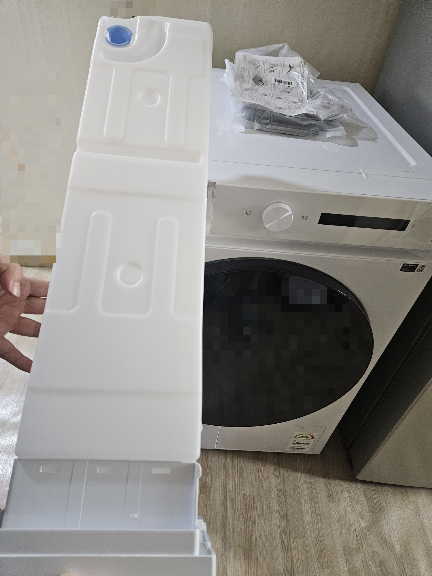 저희는 세탁실이 좁아서 주방 한쪽 모퉁이에 뒀는데, 물통이 커서 한 번에 비울 수 있고 큰 불편함은 없어요