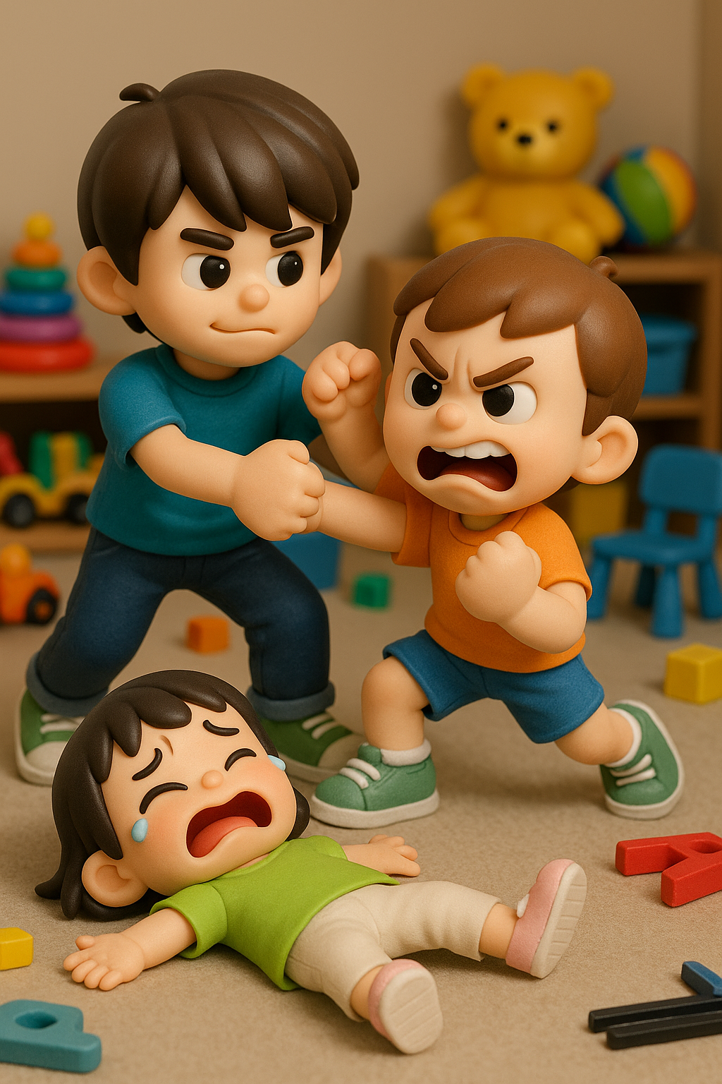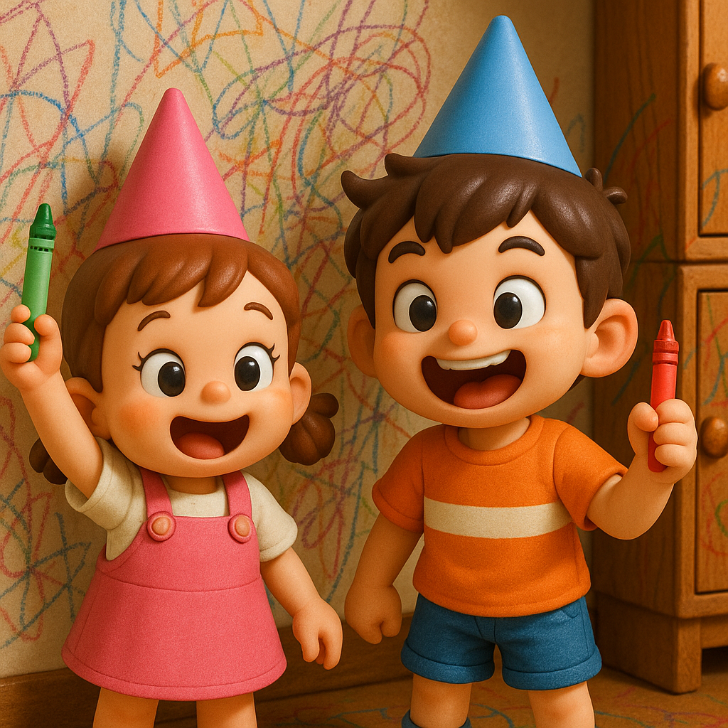 방금 치운 곳에 다시 카오스를 불러일으키는 재주가 있어요. 형한테 혼나고, 또 동생을 혼내키고!