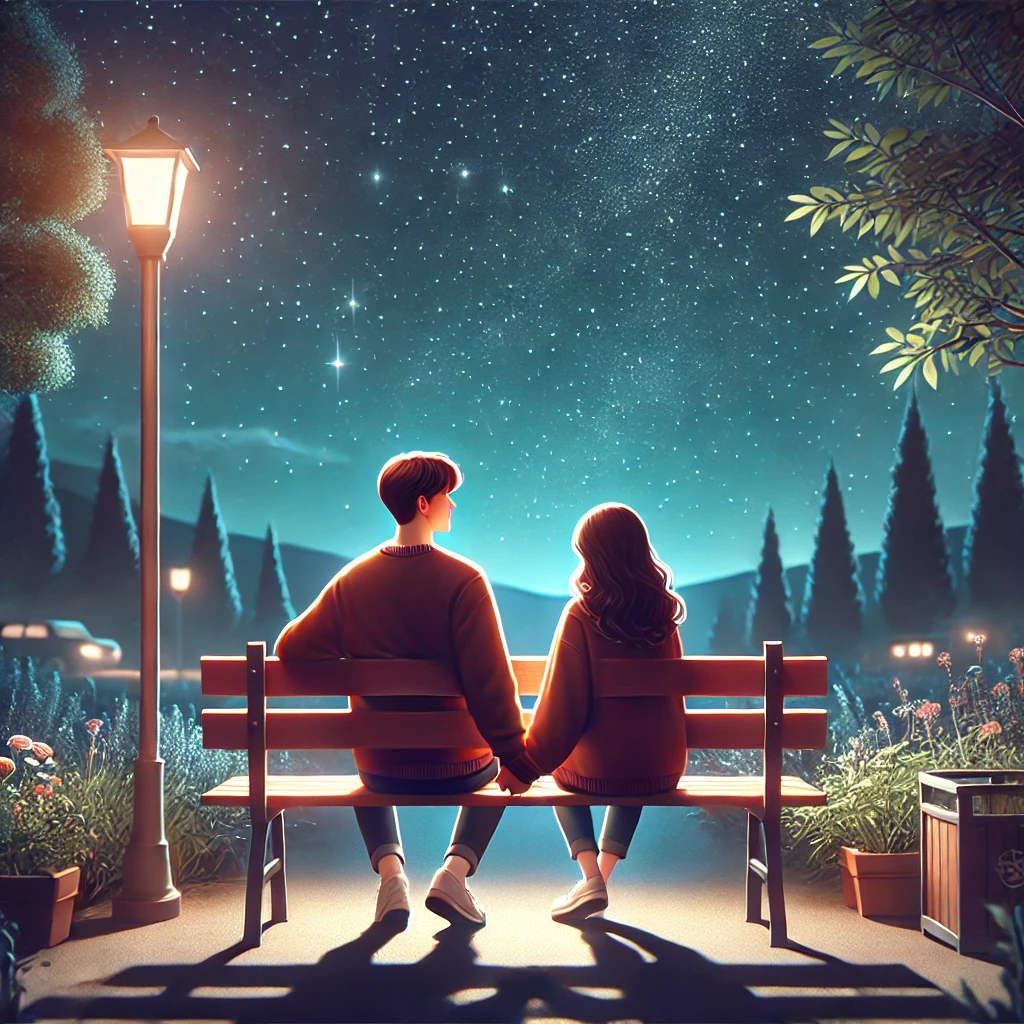 별이 반짝이는 밤하늘 아래에서, 손을 꼭 잡았어.